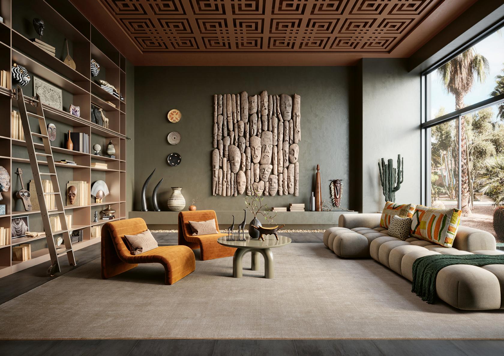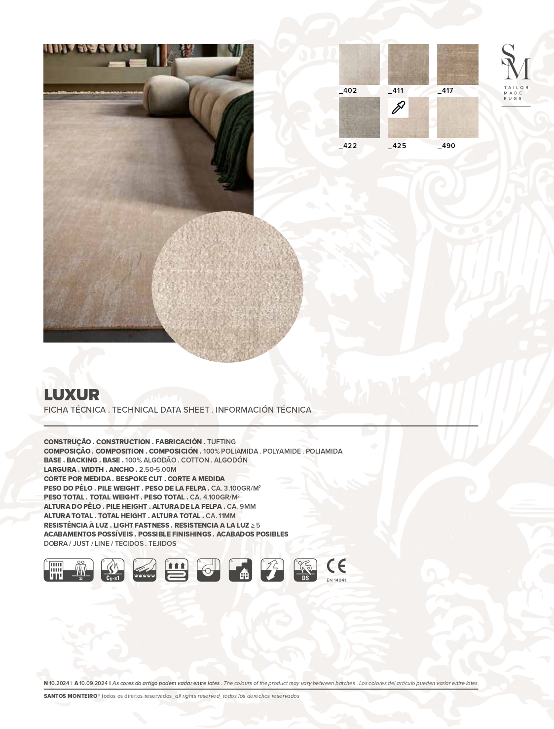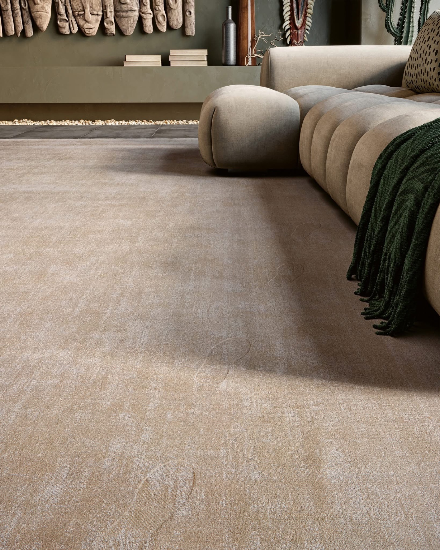 Composto por 6 tons neutros entre bege e cinza, este artigo 100% poliamida alia suavidade, resistência e um efeito visual único que confere ao espaço uma elegância tranquila.