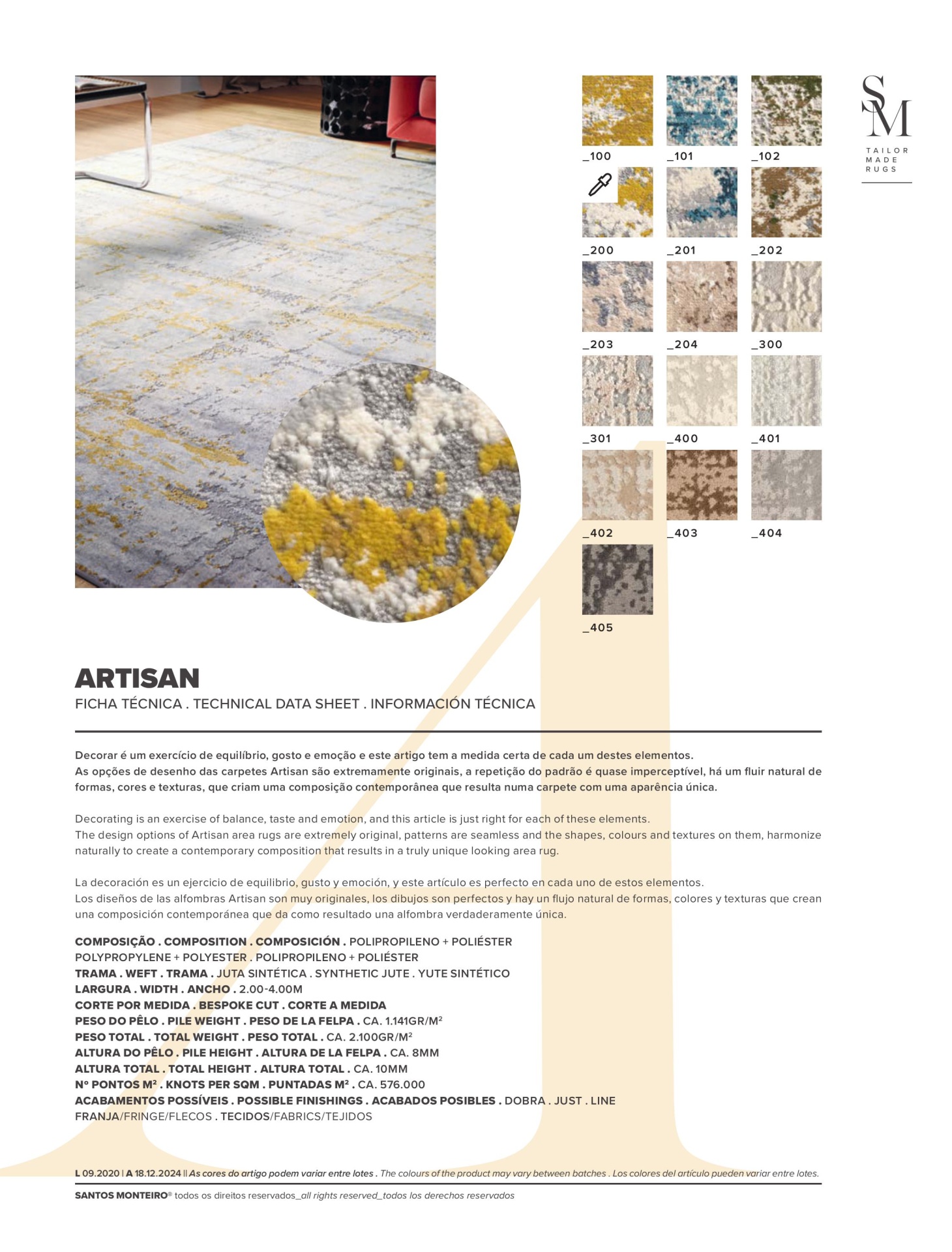 Decorar é um exercício de equilíbrio, gosto e emoção e este artigo tem a medida certa de cada um destes elementos. As opções de desenho das carpetes Artisan são extremamente originais, não existe uma repetição de padrão gráfico, há um fluir natural e elegante de formas, cores e texturas, que criam uma composição abstracta e contemporânea que resultam numa carpete com uma aparência verdadeiramente única e confortável. O toque final é a personalização com um dos nossos acabamentos recomendados.