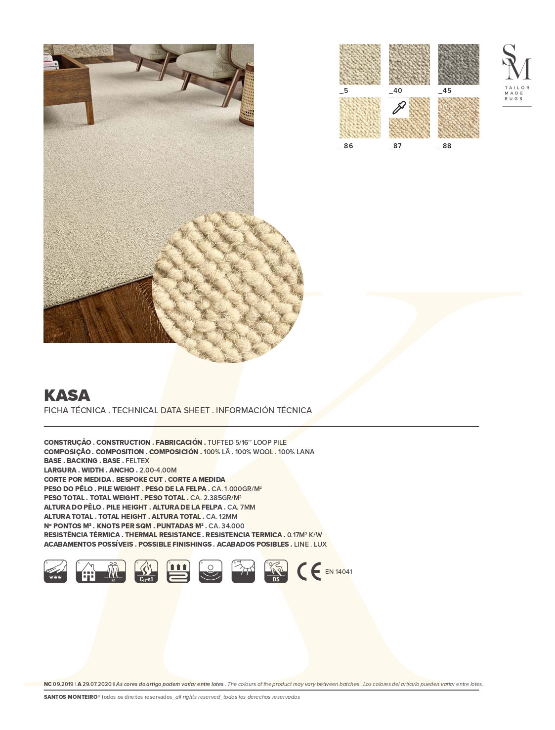A par de outros artigos construídos com fibras naturais presentes na nossa colecção, o Kasa, artigo em Lã, privilegia os tons neutros que se integram na perfeição em ambientes onde as madeiras e a pedra estão em destaque. Pode rematar as carpetes Kasa com um dos nossos acabamentos recomendados, neste caso Line e Lux, pode também optar por um dos Tecidos da nossa colecção para uma solução de acabamento assumidamente decorativa.