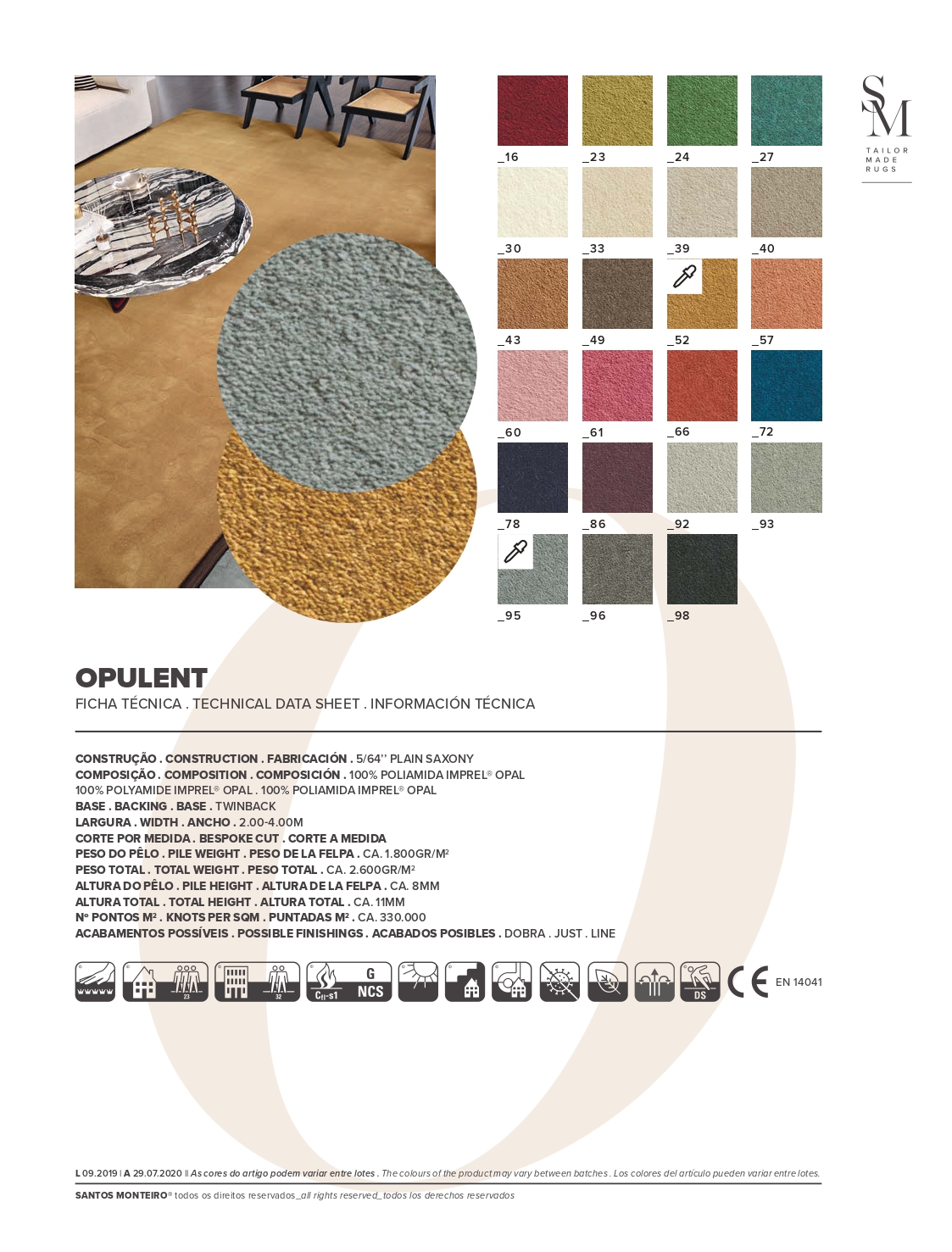 Este artigo em Poliamida é sem sombra de dúvida, riquíssimo. O primeiro impacto vai para a paleta de cores diversa e arrojada, repleta de opções. Somos também cativados pela suavidade do toque, pelo conforto 5 estrelas e pela classificação de uso comercial e doméstica intensiva, classes 32 e 23 respetivamente. As carpetes Opulent podem ser acabadas com Dobra, Just ou Line ou pode optar por alcatifar uma divisão inteira tornando-a ainda mais acolhedora.